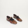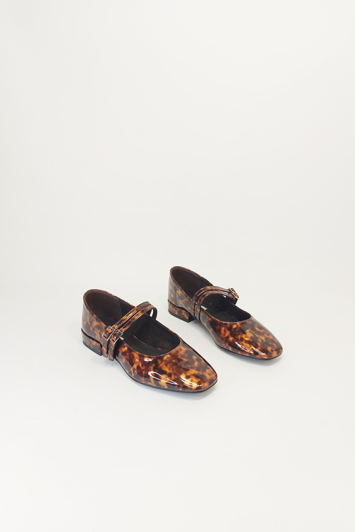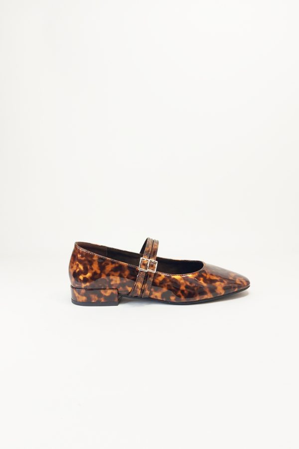 Zapatos plano tipo bailarina, estampado carey, cierre doble hebilla en el empeine.