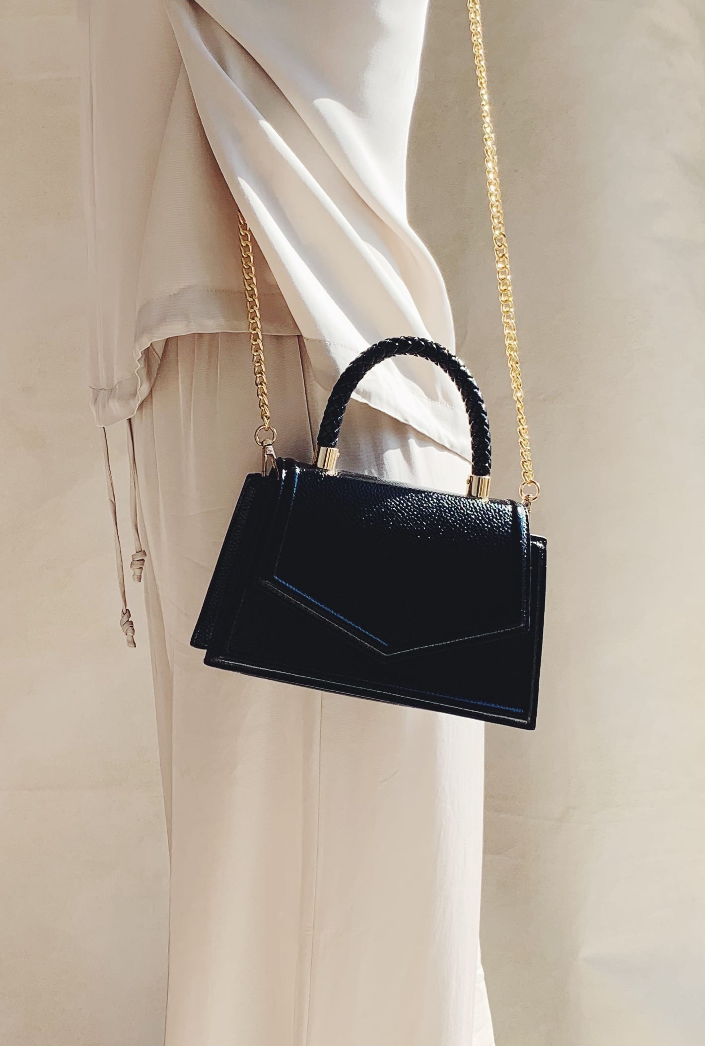 Colocación: asa de mano, asa función bandolera extraíble y ajustable, la cadena mide 127cm de largo.