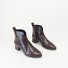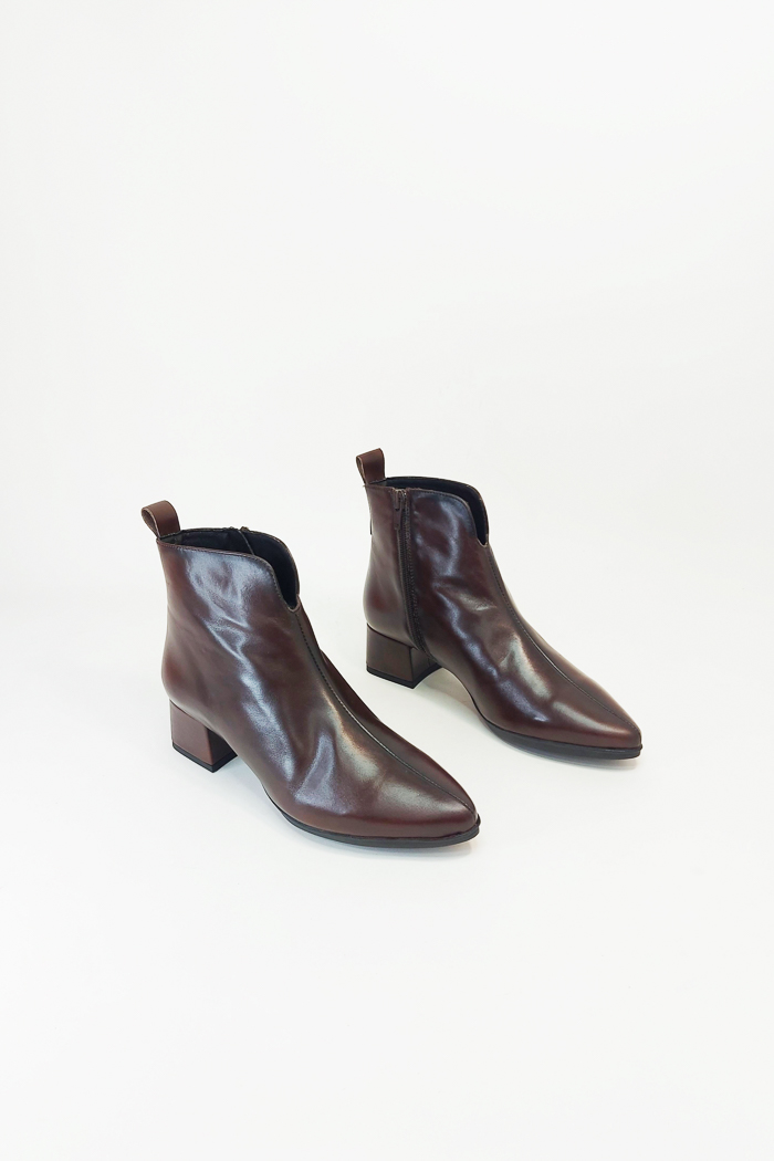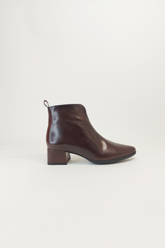 Botín piel, acabado en punta, tacón cuadrado, color marrón.