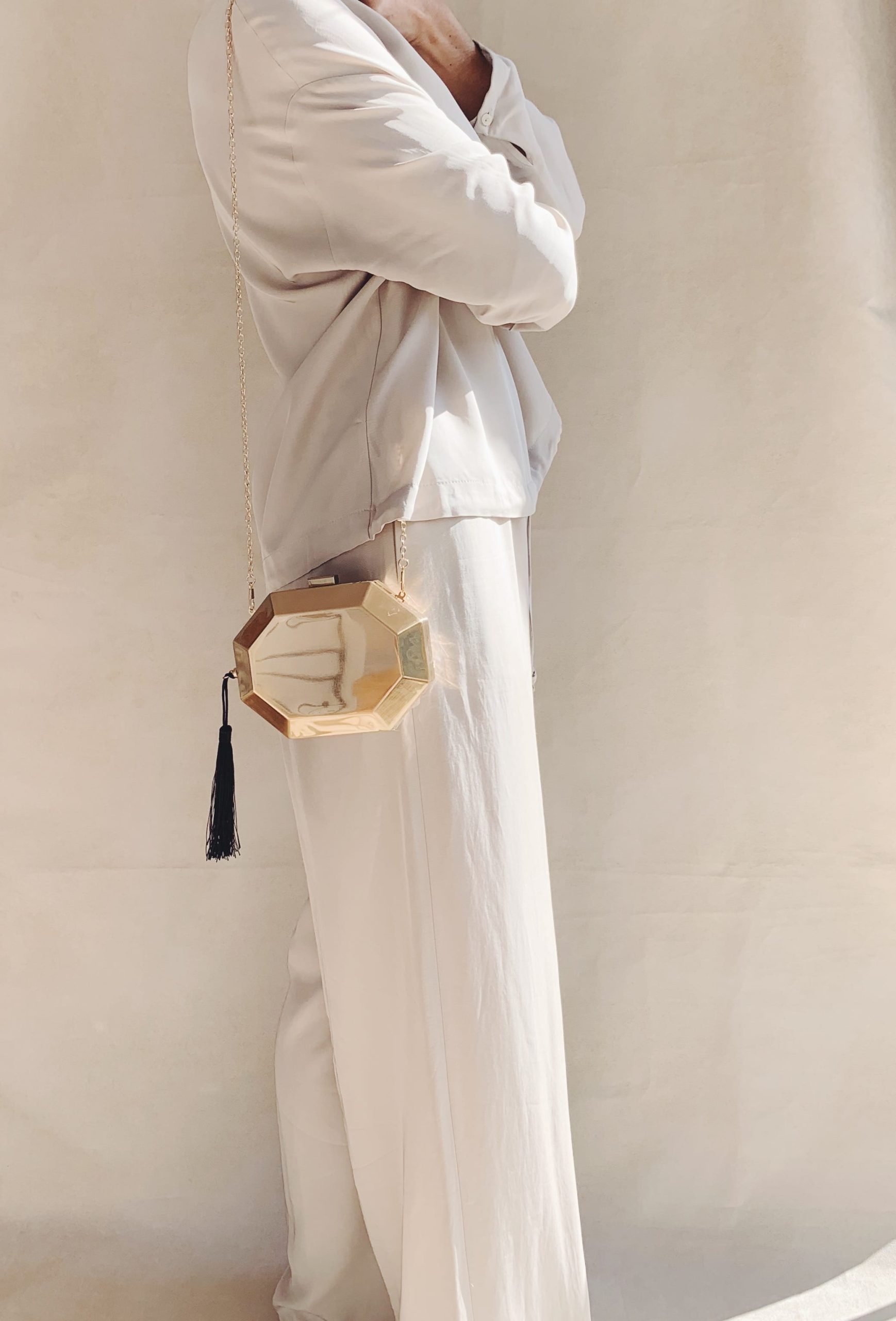 Clutch geométrico metálico en forma octogonal. Lleva una borla de color negro que queda colgando en el lateral del bolso. Se cuelga mediante una cadena metálica, de hombro o de mano y tiene cierre de click.Este es un artículo de fiesta que no admite cambios ni devoluciones.