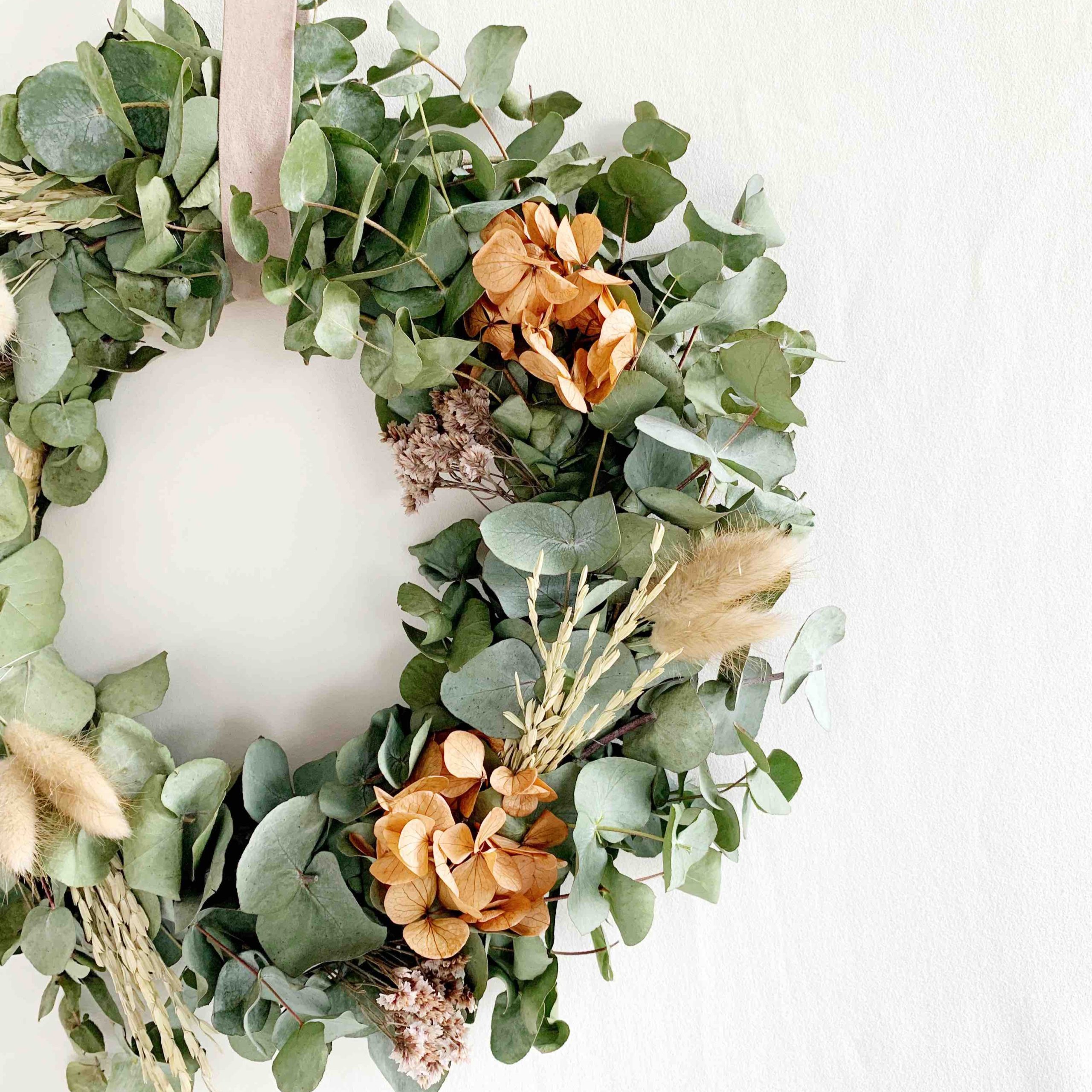Materiales: la base de la corona es eucalipto y abeto fresco, seca a los pocos días, combinada con flores preservadas (hortensia, lagurus, arroz seco y sinesis)