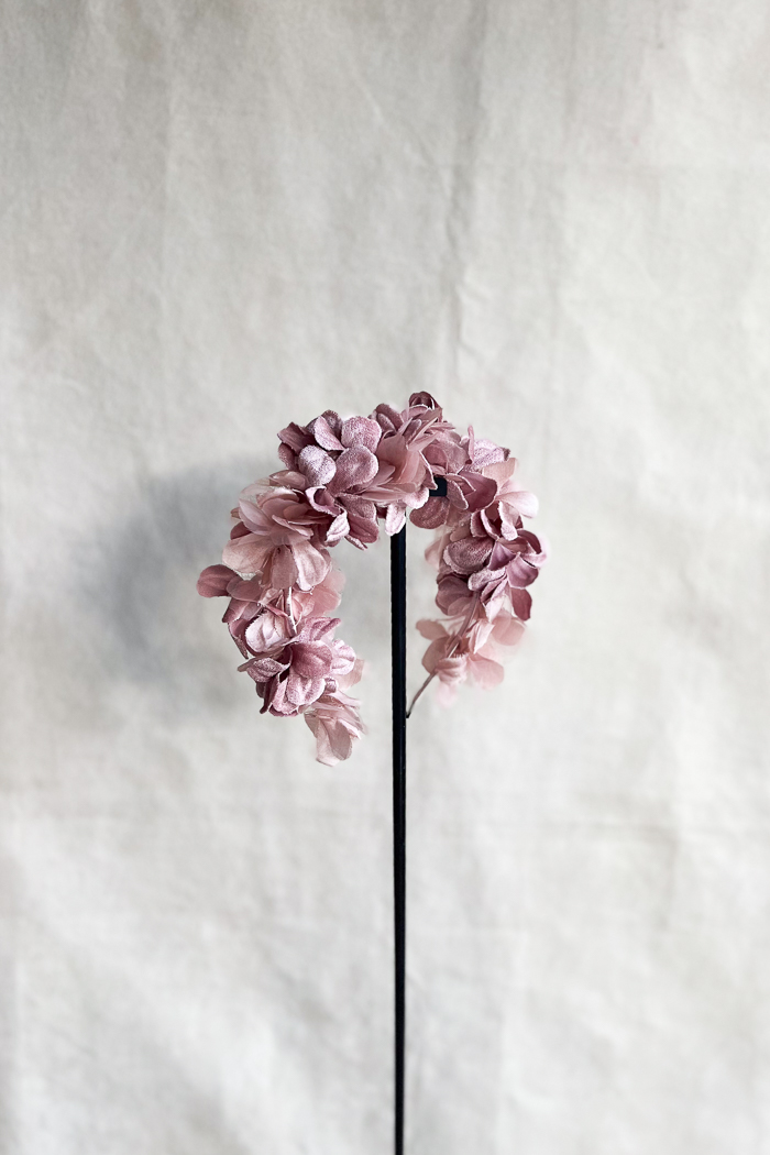 Materiales: diadema de pétalos de tela, organiza y terciopelo. Color rosa.