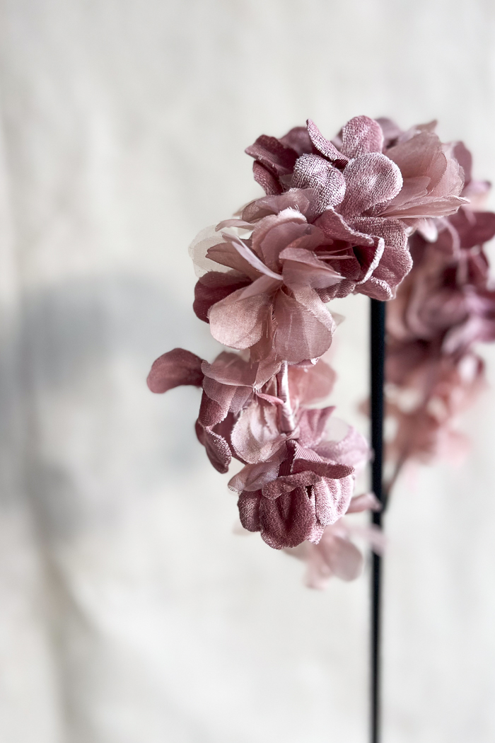 Diadema de pétalos de tela, organza y terciopelo.