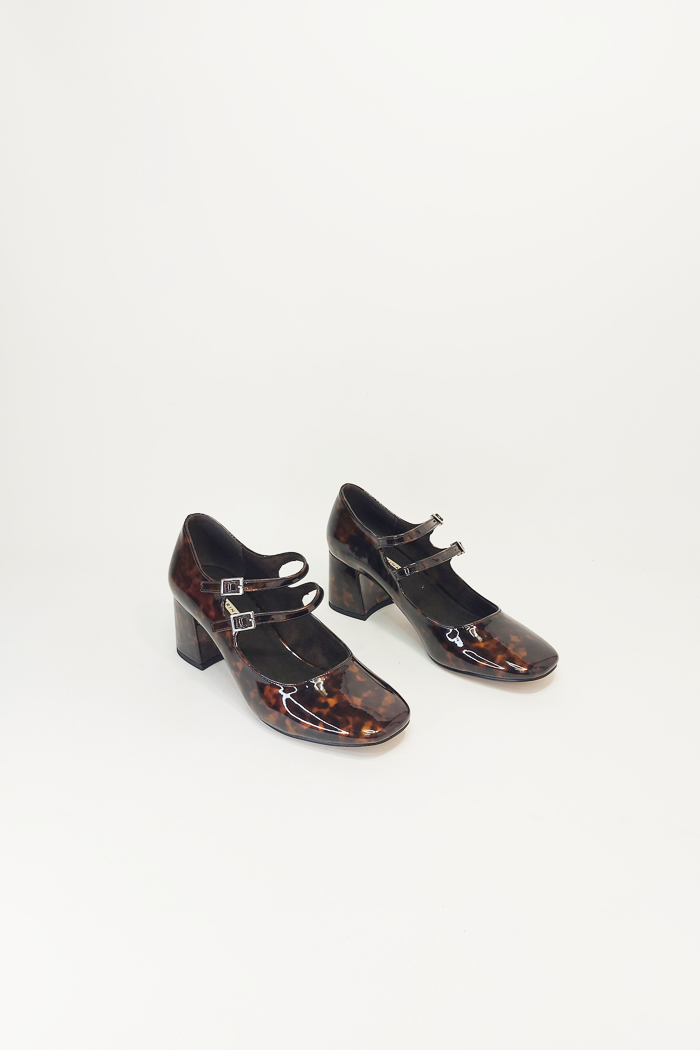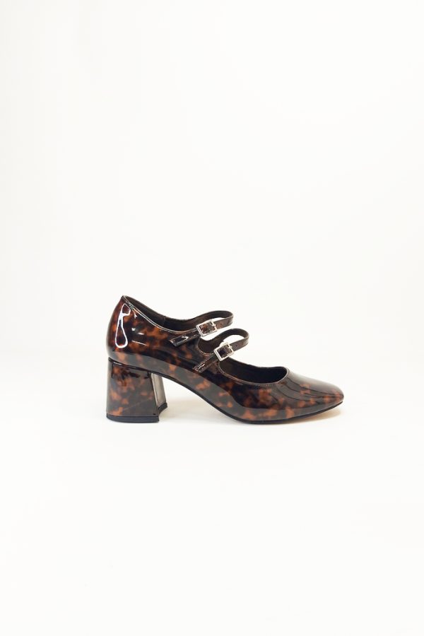 Zapato tipo mercedita, estampado carey. Tacón medio ancho. Cierre mediante doble tira con hebilla en el empeine. Acabado en punta cuadrada. Suela de poliuretano. Altura de tacón 6cm. Marca corina. Las puedes combinar con cualquier look de día o noche, se adaptan a todo tipo de pies.