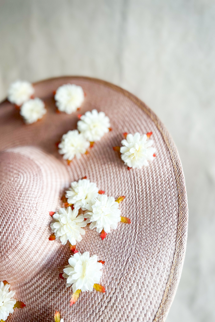 Pamela de puntal con flores de tela. Ideal para invitadas de día. Una opción súper favorecedora y muy chic con la que deslumbrar. Muy cómodo y fácil de colocar, que garantiza una correcta colocación y una comodidad absoluta al llevarlo. Inclinado hacia la derecha.