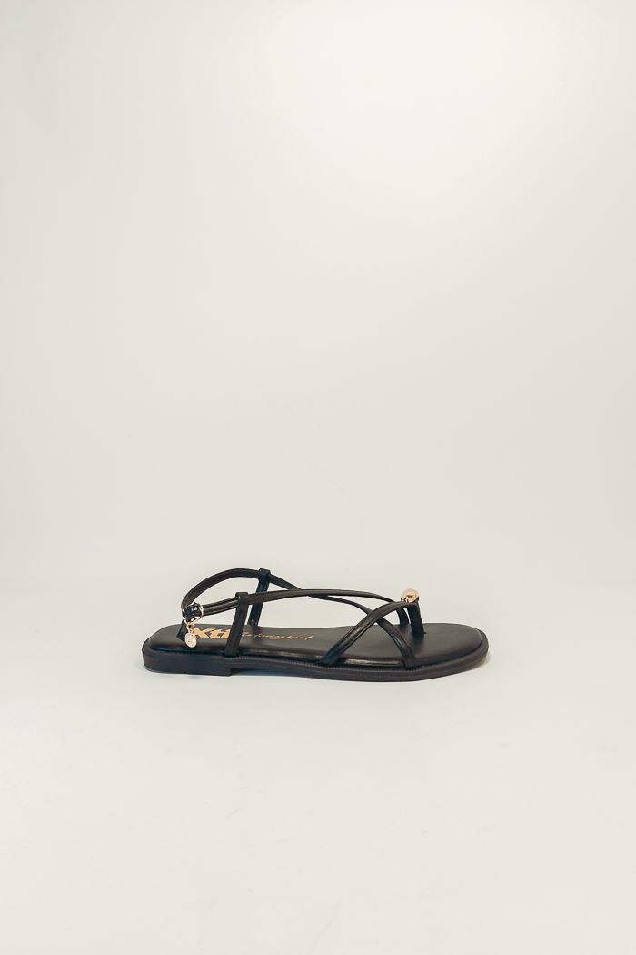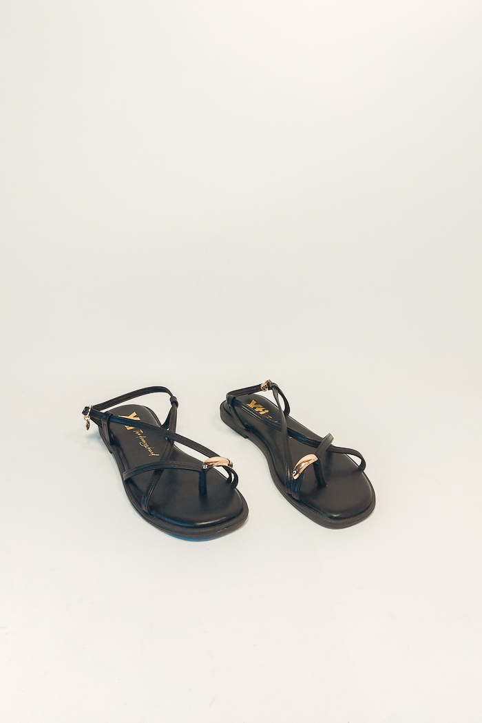 Sandalia plana estilo minimalista con detalle metálico. Cierre mediante hebilla ajustable en el talón. Altura del tacón 1cm. Ideal para combinar con looks del día a día, vestidos, pantalones, faldas…
