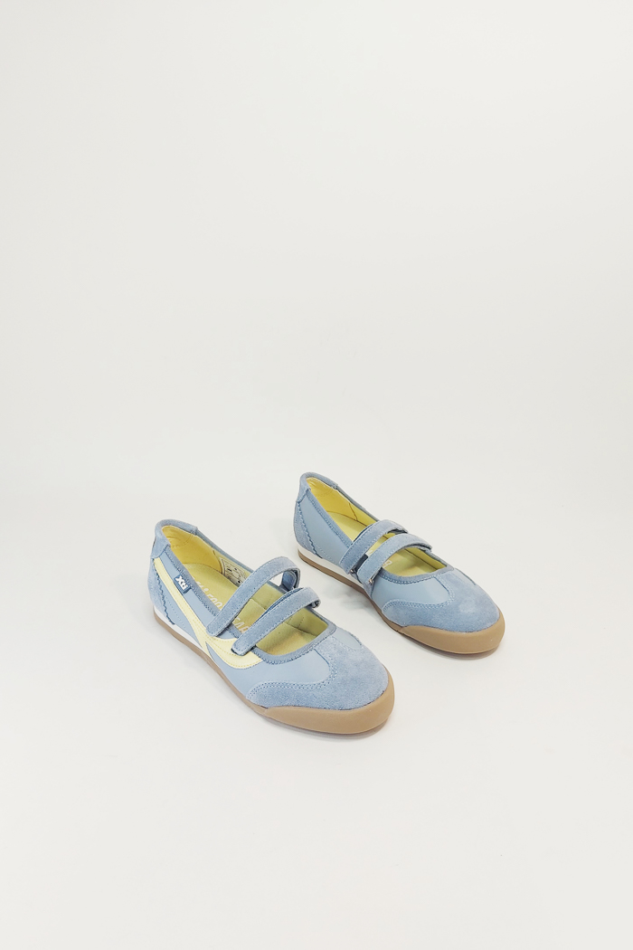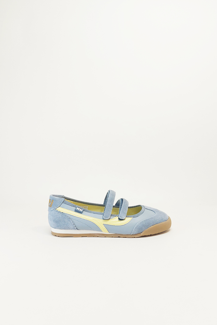 Zapatilla deportiva estilo bailarina retro. Color celeste combinada con amarillo. Corte en textil. Cierre con velcro. Altura 1,5cm. Acabado en punta redonda. Son muy cómodas, se adaptan a todo tipo de pies y se ajustan del empeine con los velcros, se pueden combinar con cualquier de primavera-verano. Ideal para el día a día.