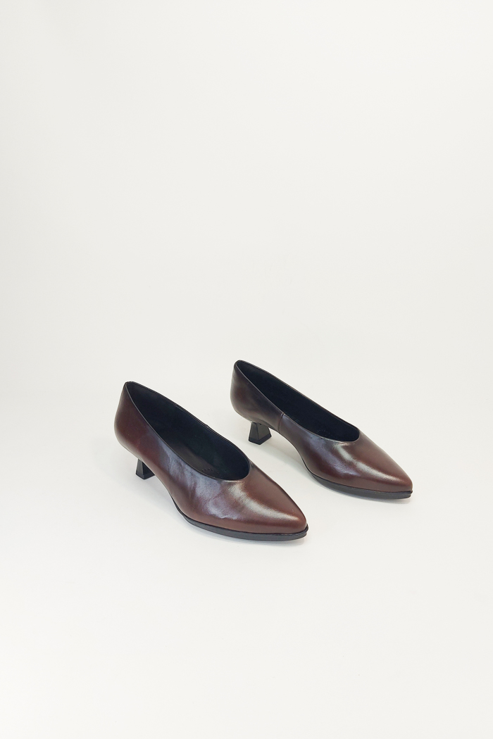 Zapato de piel marrón, tacón bajo, acabado en punta.