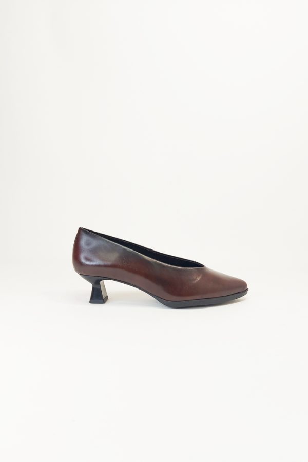 Zapato tacón bajo de piel color marrón.  Altura del tacón 3cm. Acabado en punta. Disponible en burdeos y negro. Son muy cómodos, se adaptan a todo tipo de pies. Se pueden combinar con jeans, faldas largas, vestidos, con el look que más te guste.